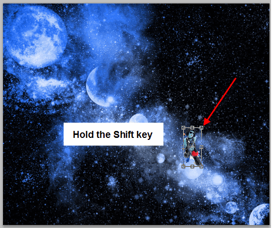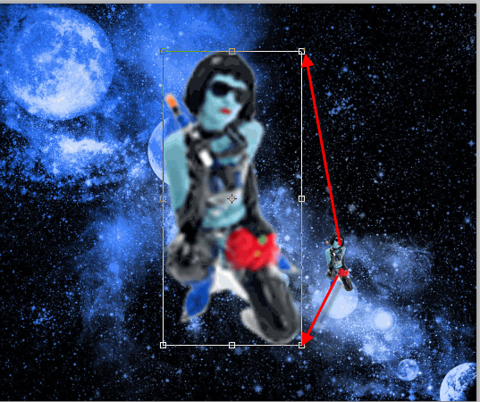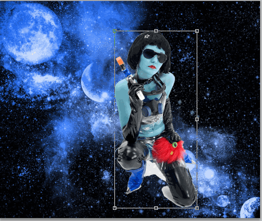 Tool and now hold down the Shift key and left click and drag on a corner anchor and make the Space Girl small. Remember the Shift key keeps the image that you're re-sizing proportional.
