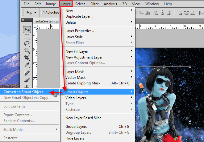 With the Space Girl selected. Go to Layer > Smart Objects > Convert to Smart Object.