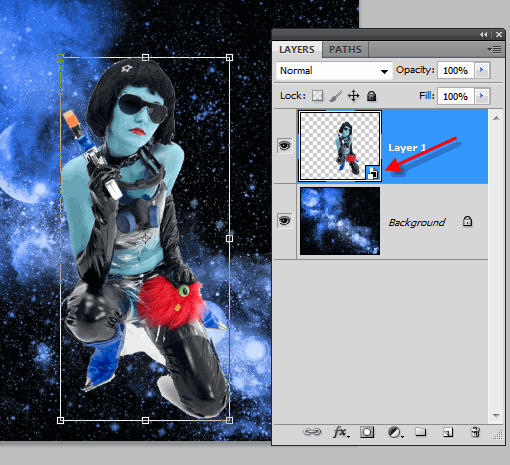 Notice in the Layer Panel the little icon in the bottom right corner. This is the icon that let's you know that it's a Smart Object. Now that the Space Girl is a Smart Object, re-size it and make it small again.