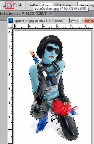 Next go to Select > Inverse to flip the selection from the background to the space girl. Because we want to add just the space girl to the solar system image.